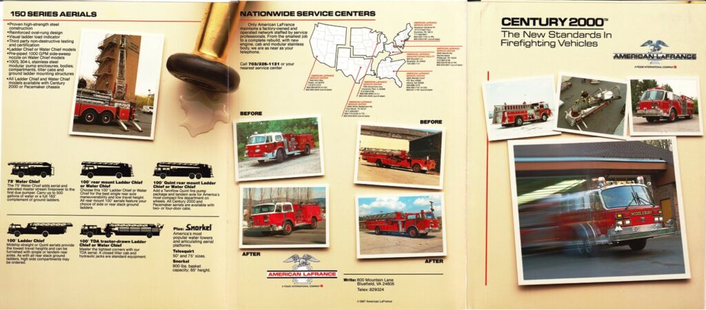 During that nearly decade long time span, over 100 pieces of fire apparatus were built. Additionally, several Century2000s were built at the various American LaFrance Service Centers. Also, many Elmira-Era fire apparatus were refurbished at Bluefield and the Service Centers. Many of those refurbished had their frames extended and Century 2000 cabs attached.