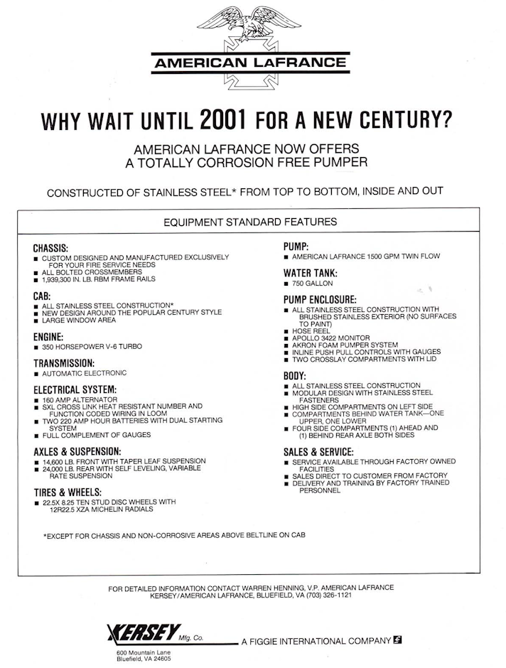 In 1985, the Figgie International facility, Kersey Manufacturing Company at 600 Mountain Lane, Bluefield, Virginia became the “new” home to American LaFrance. A Ford cab-over chassis, along with a modular body brought from the Southport, NY plant became the first apparatus produced at the ALF/Kersey facility. This apparatus was nick-named “The Rebel” and was sold to the near-by Bluefield, West Virginia Fire Department. Later, the Century 2000 cab was designed and its production was launched with a stainless steel body, canopy-cab, 1000 GPM pumper built for the city of Albany, New York Fire Department. Production of the ALF/Kersey apparatus continued until 1994.