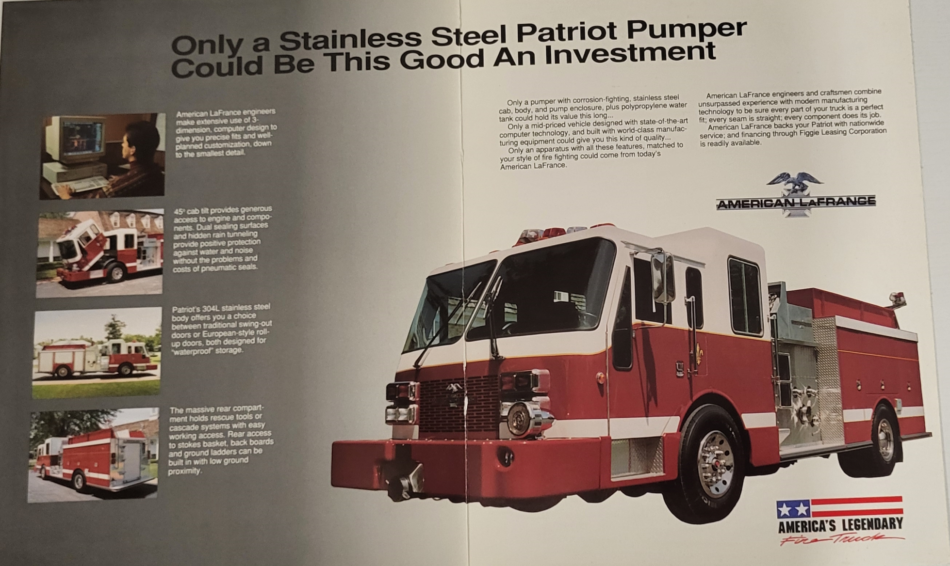 Kersey/American LaFrance production centered on two models of the Century 2000, the two-door canopy cab and a four door enclosed sedan cab. The sales literature listed 120 standard items and a price tag of $185000.00 for the standard model. The first few built were for long time American LaFrance customers including Deer Park, New York who purchased a pair of sedan Century 2000s.