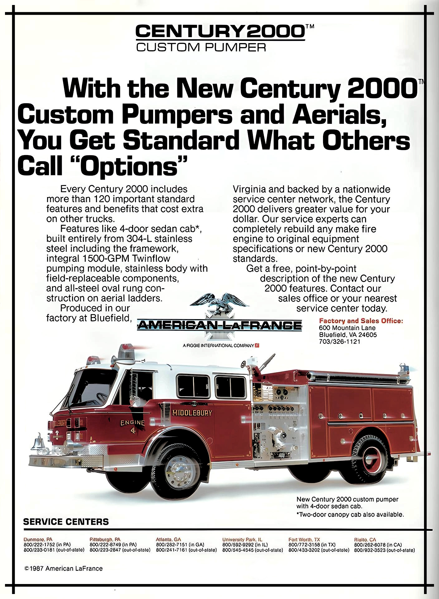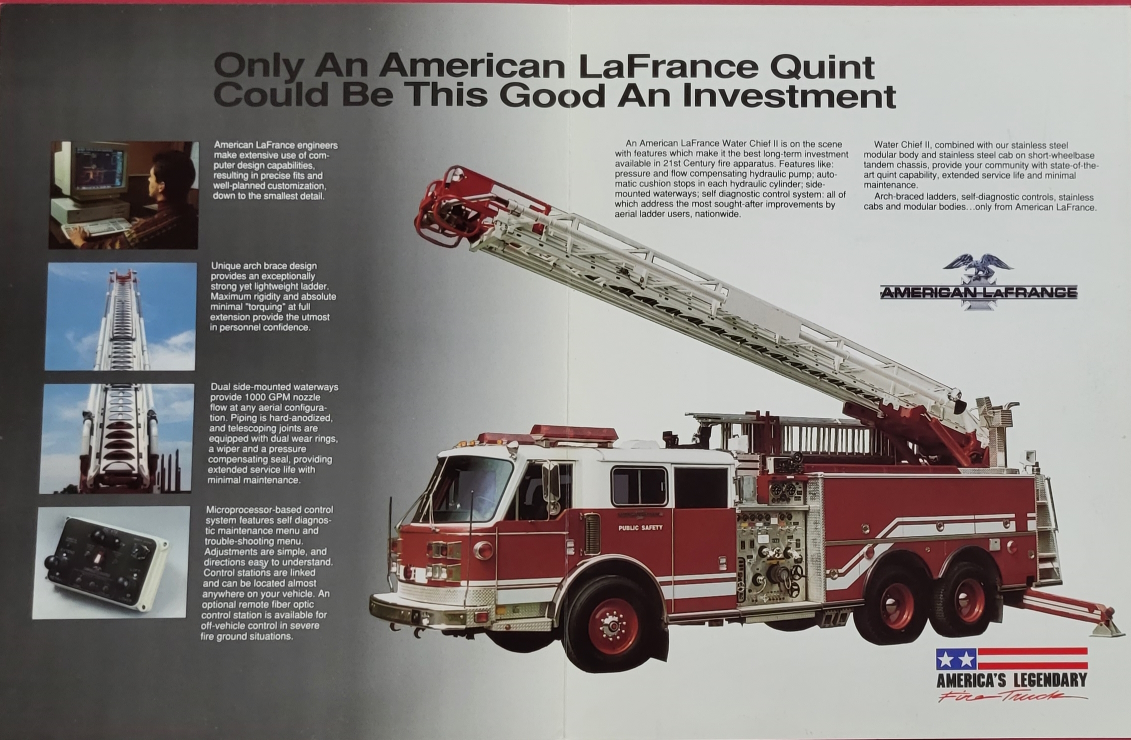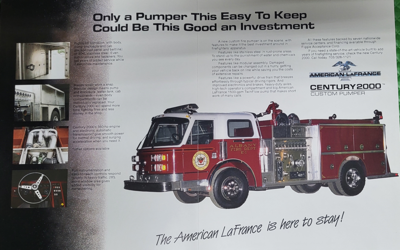 In early 1986, Figgie announced that the facility in Bluefield would begin producing American LaFrance fire apparatus. The newly designed “Century 2000 series” would be made by Kersey/American LaFrance. This design retained the “signature” American LaFrance look of the Century series, but was wider, lower, its windshield larger and nearly the entire body was made from low carbon 304L stainless steel. The first of the line was produced for a long-time American LaFrance customer, Albany New York. This engine was a canopy cab, 1500 G.P.M. pumper featuring a 500 gallon fiberglass water tank, 350 H.P. diesel motor, automatic transmission, Akron foam system, it was painted American LaFrance red with a snow white roof and was adorned with the city’s Tricentennial seal on the front doors.